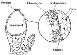 c. Food particles > Ostia > Choanocytes> Intracellular digestion > Archaeocytes >distributed to other cells of the body à Undigested food expelled through osculum