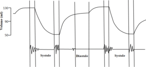 14. (1 point) The changes in the ventricular volume over a cardiac cycle in a healthy human are represented below.