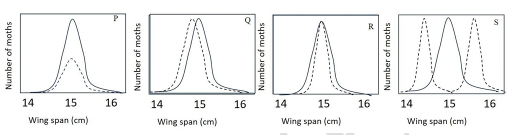 17. 1 point) The following figure shows how the wing span of a polyphemus moth species migrated/diversified to four unconnected geographies (P, Q, R, and S) respond to different environmental conditions they encounter during a year.