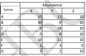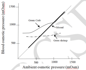 44. (3 points) The osmotic pressure of blood plasma as a function of the ambient osmotic pressure for three species of marine invertebrates namely the blue mussel, the green crab and a species of grass shrimp is shown in the graph. The thin solid line is a line of equality between blood osmotic pressure and ambient osmotic pressure.
