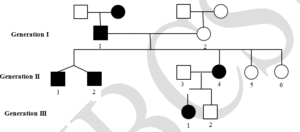 46. (2 points) A pedigree representing the transmission of brachydactyly (short fingers) in a family is shown below. Persons with short fingers are indicated by filled circles (females) and filled squares (males). None of the grandparents of generation II is a carrier for the trait.