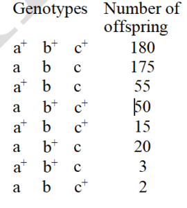 49. (3 points) In a genetic study involving corn (Zea mays), three genes, gene a, b, and c are located on the same chromosome. A geneticist performs a three-point test cross to determine the distances between these genes. The following data shows the number of offspring with different genotypes: