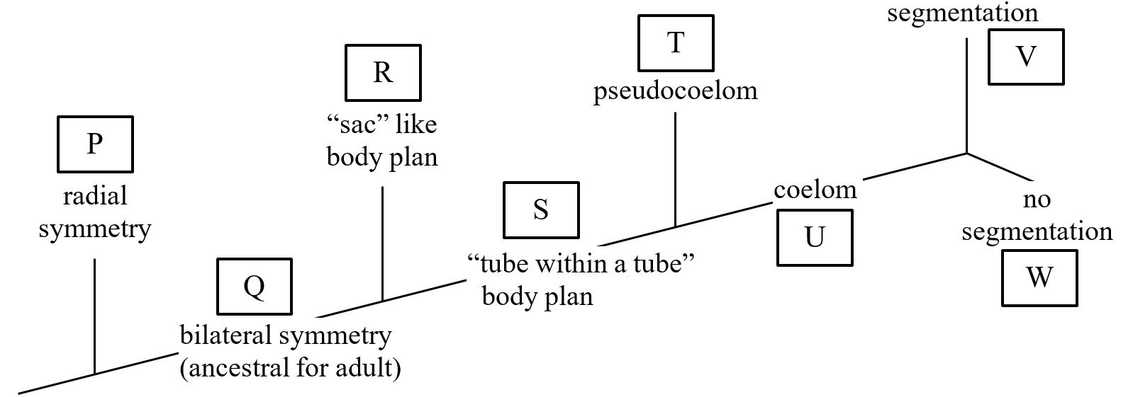 Indicate the position of the following phyla (1 – 4) in the cladogram and fill in the respective alphabet (P – W) in the blanks.