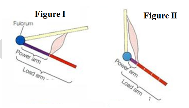 13. (1 point) Bones constitute a system of levers that are moved around joints by the muscles. Two representative figures are shown below (I and II)