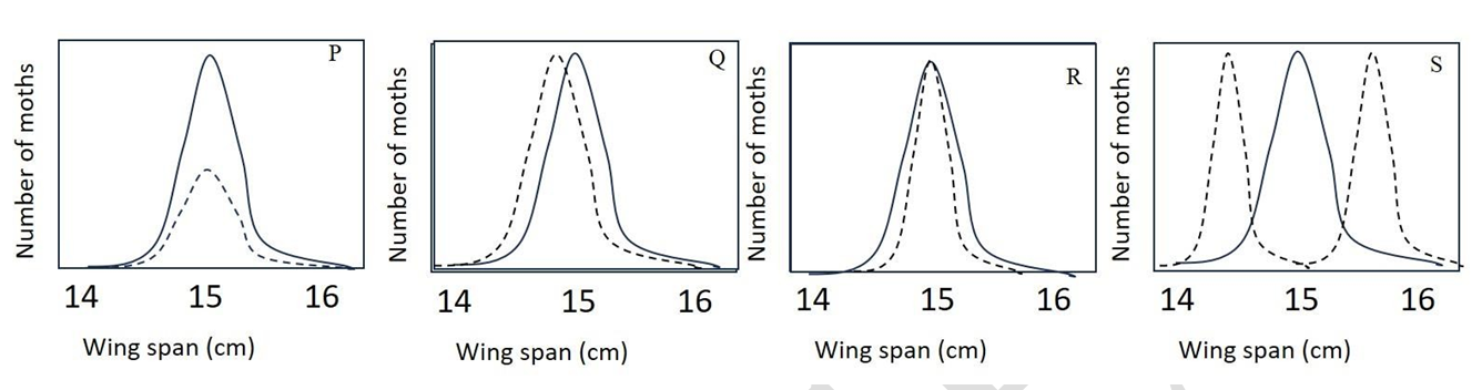 17. 1 point) The following figure shows how the wing span of a polyphemus moth species migrated/diversified to four unconnected geographies (P, Q, R, and S) respond to different environmental conditions they encounter during a year.
