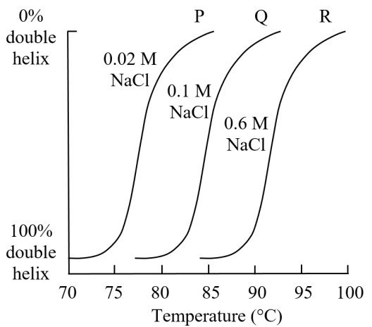 d. If one measures absorbance of the DNA strands at 260nm, R is likely to show greatest absorbance at any temperature between 70 – 100°C as compared to P and Q.