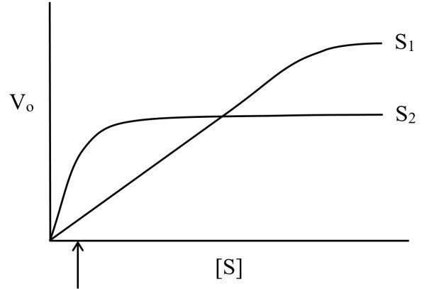4. (1 point) Amino acid glutamine is required for cancer cells to survive and proliferate. Enzyme glutaminase breaks down glutamine into glutamate and ammonia. Glutaminase was obtained from two different sources, S1 and S2. Their kinetic properties are shown in the graph. The arrow indicates the concentration of glutamine in the cell environment. Based on the kinetics, can any of these enzymes be considered for possible cancer treatment?