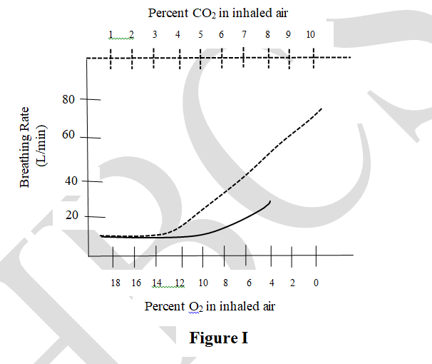 42. (2 points) The changes in the breathing rate in response to changes in CO2 and O2 levels in inhaled air for dogs is shown in figure I.