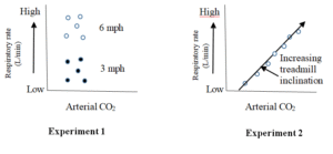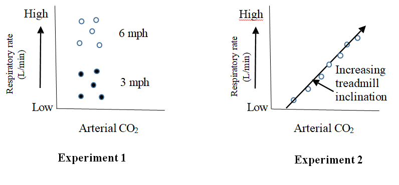 Experiment 1: Dog runs on the treadmill set at two different speeds. The respiratory rate is plotted as a function of arterial CO2 concentration