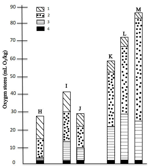 1, 2, 3 and 4 most likely respectively represent oxygen stores in which of the following parts? Choose the correct option and put a tick mark (✔) in the appropriate box. - a. Blood; lungs; body fluids other than blood; myoglobin