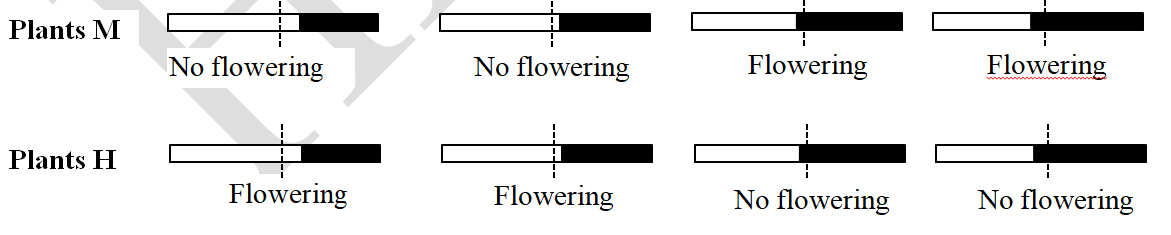 8. (1 point) The observations regarding flowering in two plants Maryland mammoth tobacco plants (M) and Henbane Hyoscyamus niger (H) plants grown in artificially varying day and night lengths are shown below. The dashed vertical line indicates 14 hr.